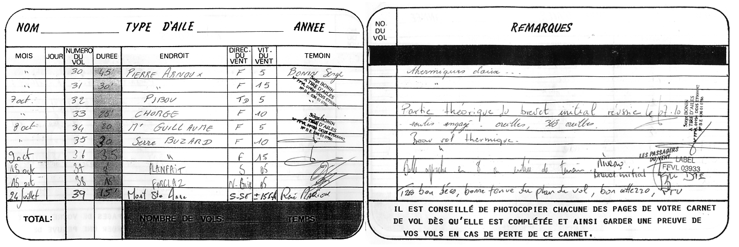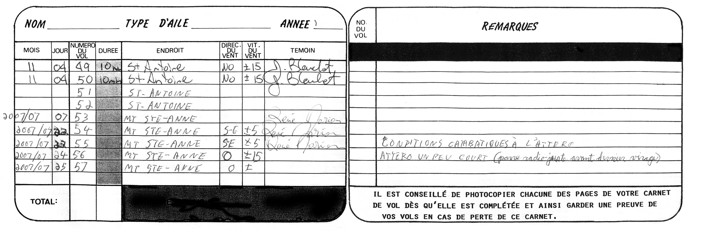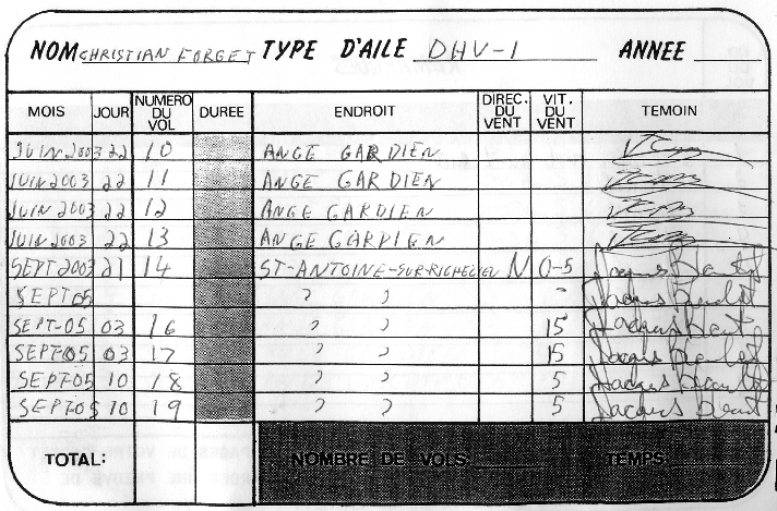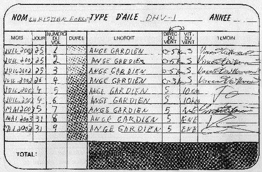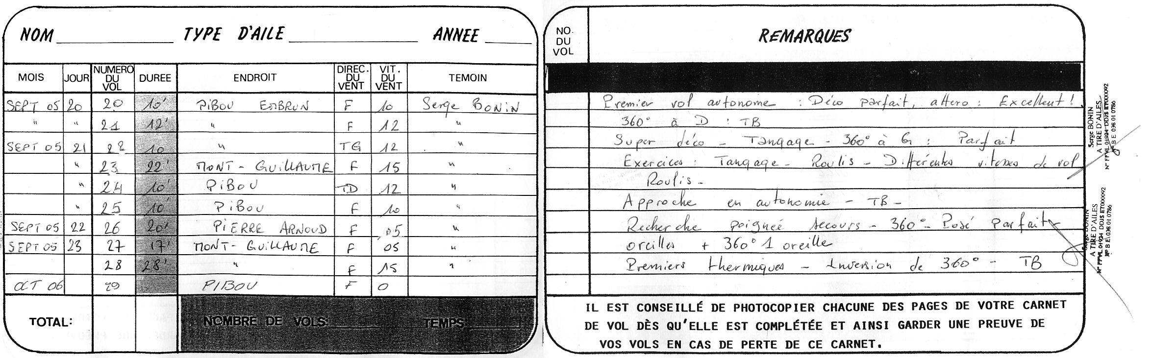 Mon carnet de volpage 1 page 2 page 3 page 4 page 5 page 6 RéférencesMon aileJ'ai succombé â la tentation d'acheter la Ozone Mojo presque neuve avec laquelle j'apprends â voler. Mini diaporamaVoici quelques images qui je l'espère, sauront témoigner une partie de ces émotions que m'a procuré ce MAGNIFIQUE voyage! Cliquer sur "Start" pour un défilement automatique â intervalle de 10 secondes. Fin 2004 - 2005Jacques Blanchet de Voiles Quatre Saisons accepte de poursuivre ma formation au treuil. J'y avais fais 19 vols au 10 septembre 2005, soit deux jours avant mon départ pour la France. 2004Bien que la plupart des pilotes de vol libre s'entendent pour dire que je suis techniquement prêt pour effectuer mon premier vol â la montagne, l'école ne se sent pas prête â gérer les risques, du moins, pour l'instant. 2002 - 2003Devant ma détermination â vouloir voler, l'école du Mt-Yamaska me donne un peu de «mou» dans la corde et accepte de me faire voler au treuil.