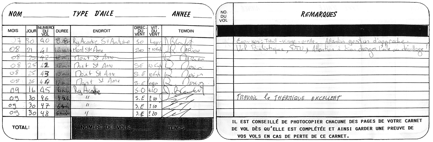 2001Je décide de passer au parapente je fais l'acquisition d'une aile usagée avec laquelle je pratique toujours, en pente école. 2000Suite â une visite du Salon du Grand Air, j'essaye le simulateur de deltaplane d'une école qui y exposait. Je m'inscris donc â cette école, située au Mt-Yamaska pour y suivre des leçons de deltaplane. Tout cela a bien commencé mais les difficultés et les malentendus ont amené la fin de ma formation. |